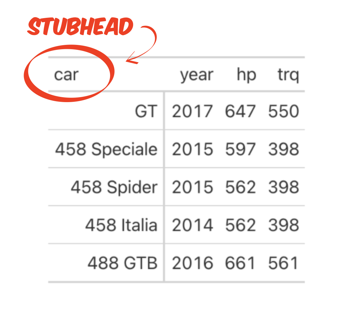 You are making a table for publication, and you want to add a label above the row names, to the left of the column names. In the vocabulary of the gt package, the row names are called a stub and this type of label is called a stubhead.