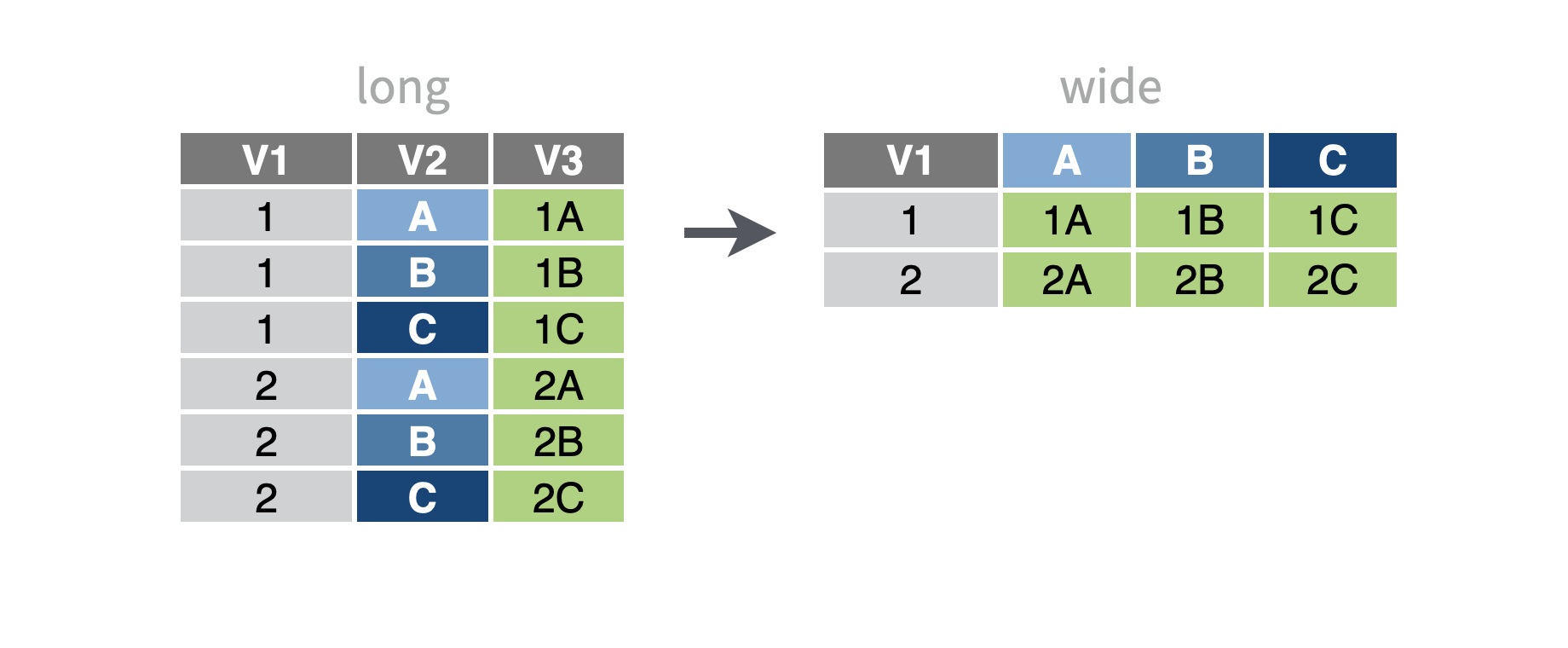 Step 3 - Identify the column to borrow new column values_from. pivot_wider() will redistribute these values across the new columns, recreating the relationships that existed in the original data frame.