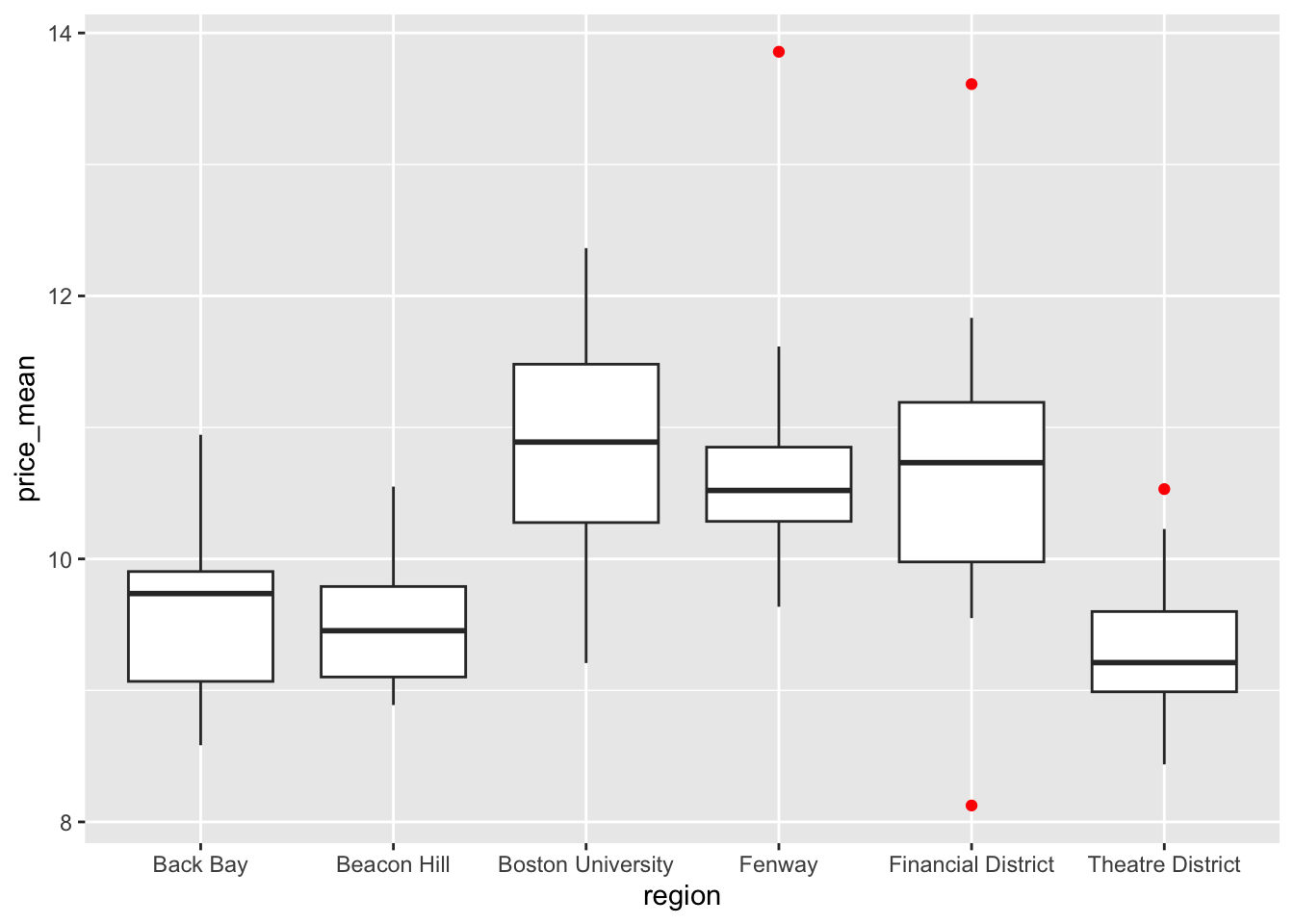 To begin, we load the ggplot2 package. Next, we create a plot with region on the x-axis, price_mean on the y-axis, and color the outlier points red.