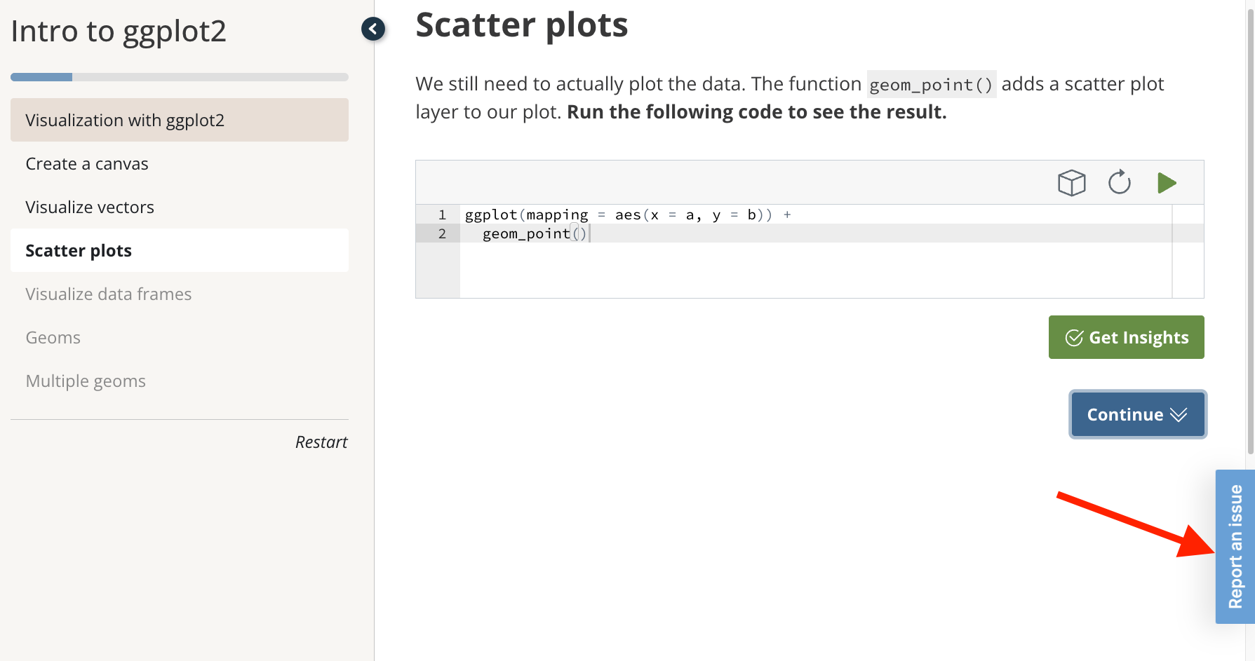Report a technical issue to the Academy team using the blue button in the lower right corner of your screen.