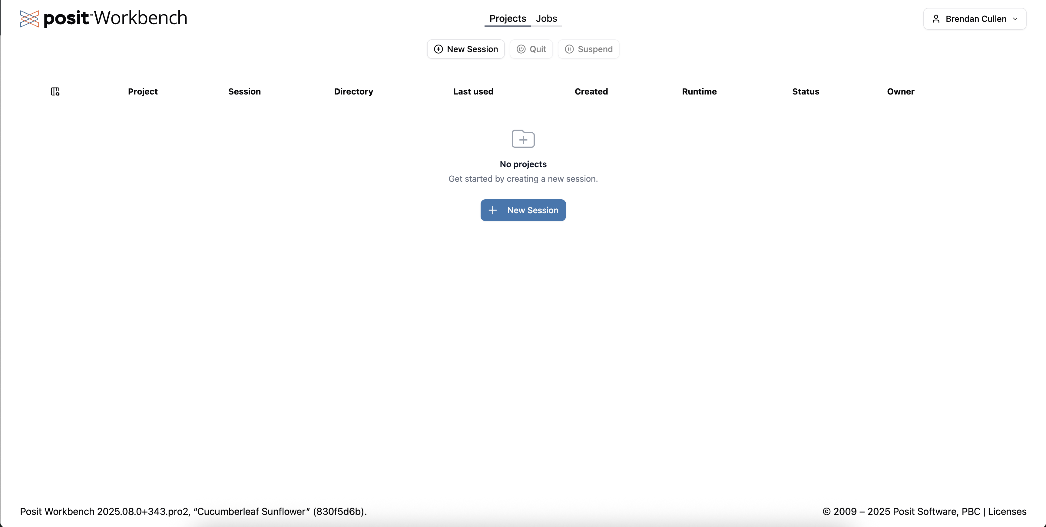 This will open Posit Workbench. From here you can click New Session to launch a new Positron session.