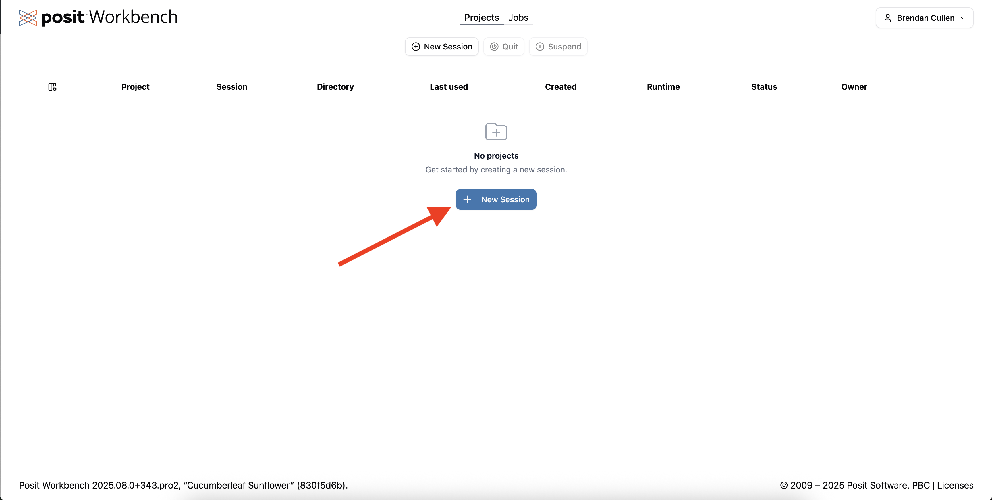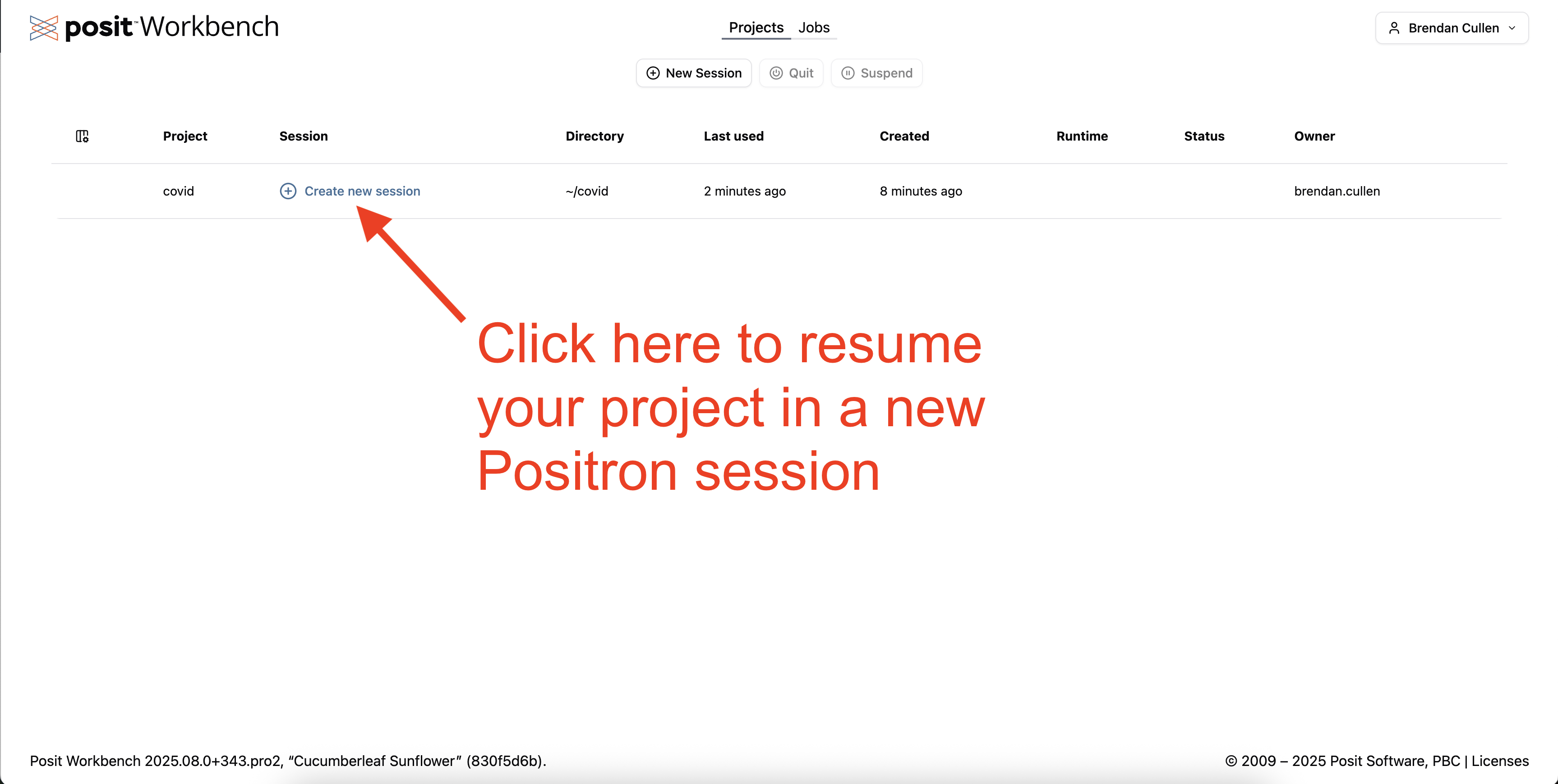 To resume working on your project, click Create new session next to your project name. This will automatically open a new Positron session with your project files loaded in your working directory. You may also have the option to simply click on a pre-existing session and resume that session.
