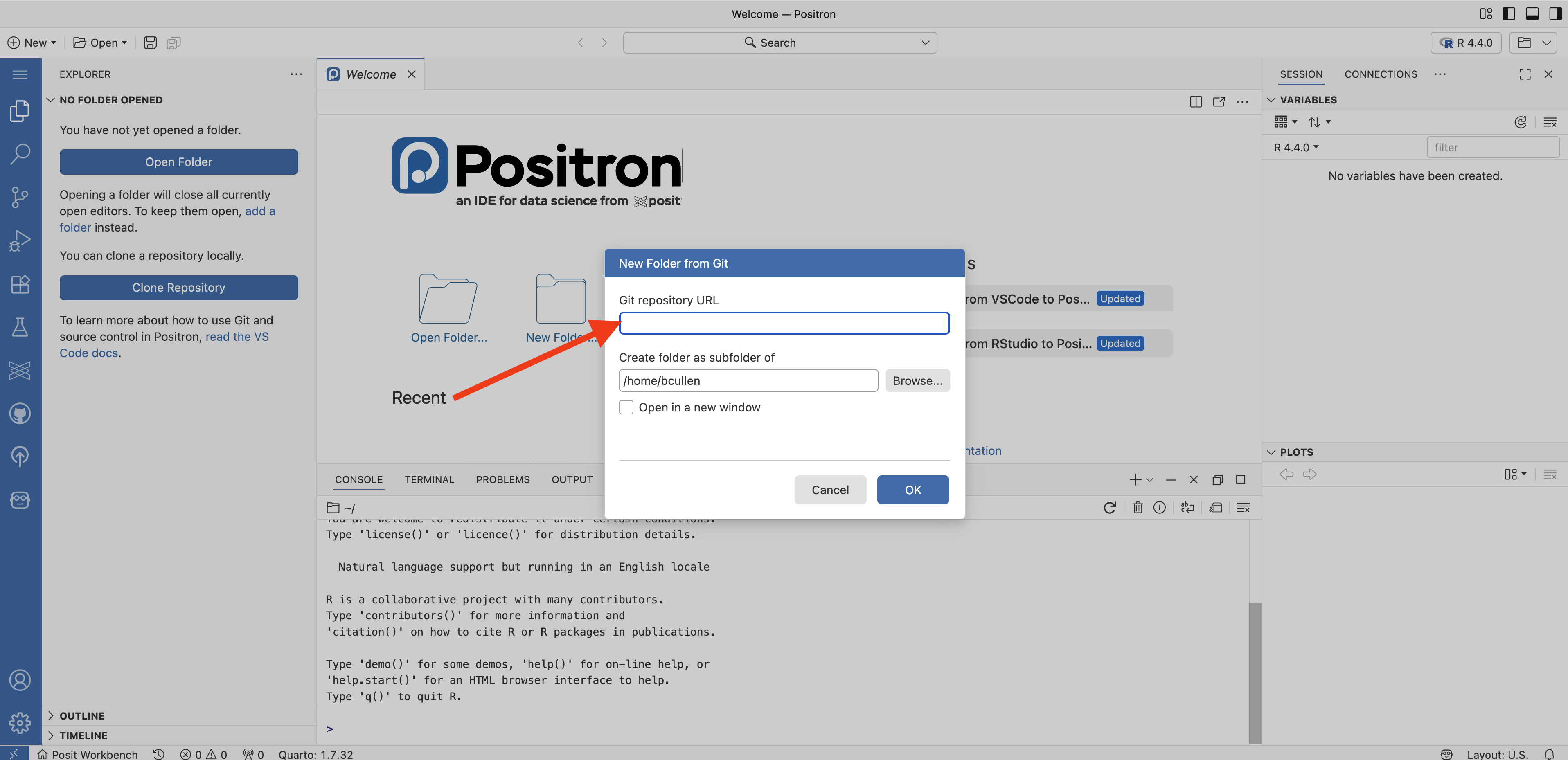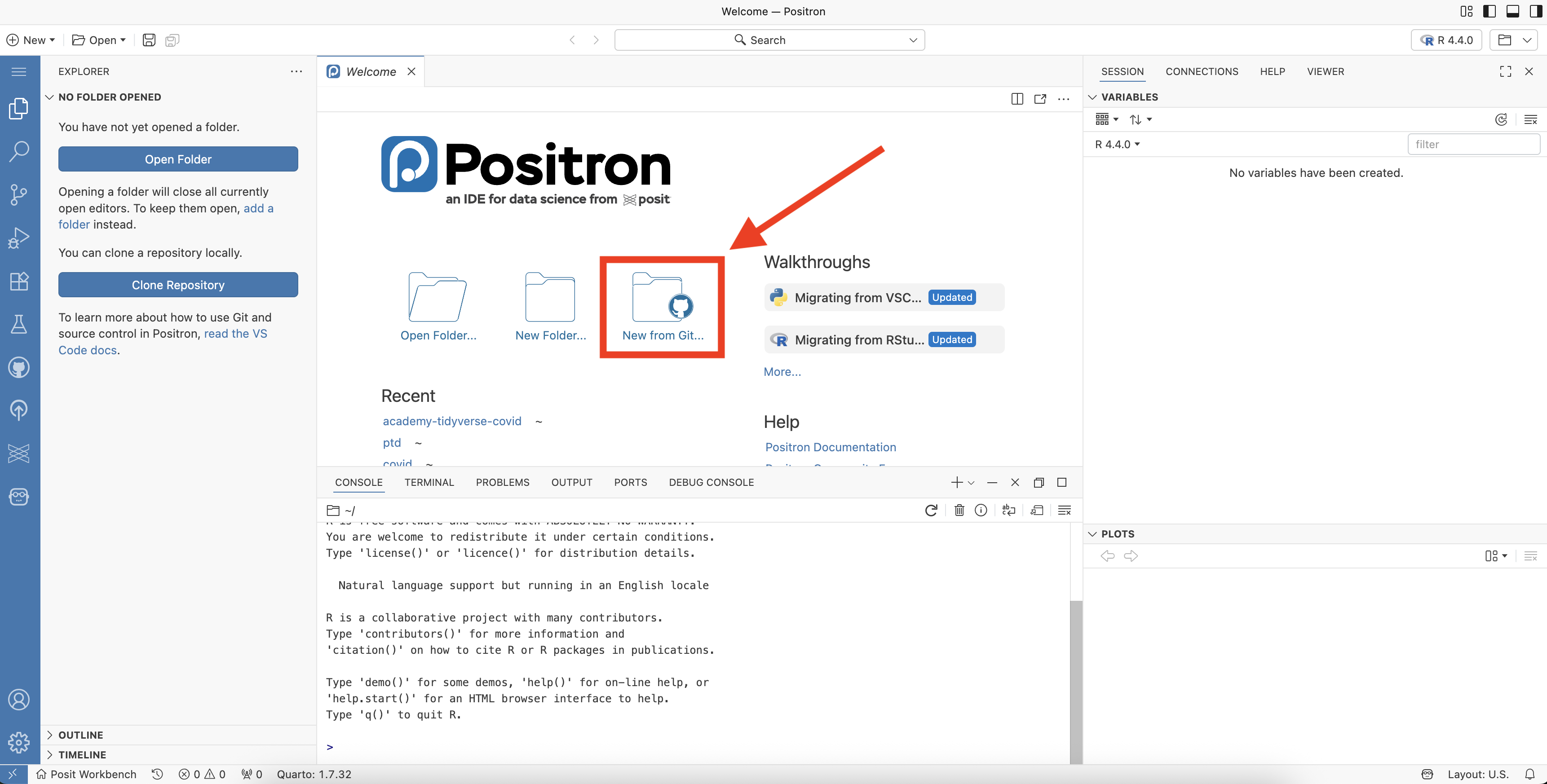 This will launch a new Positron session in Posit Workbench. Click New from Git.