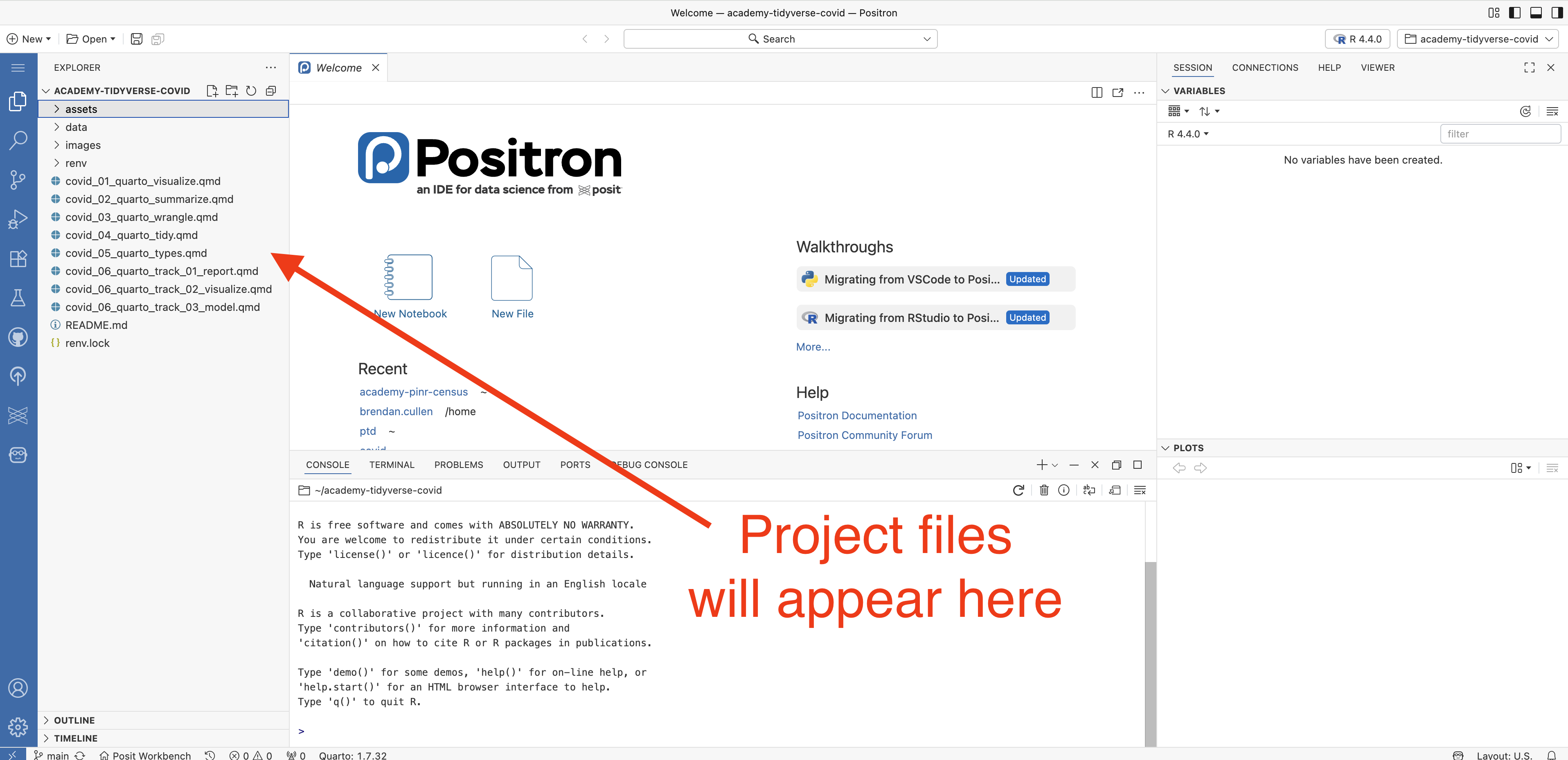 Follow the instructions below to set up your Academy project in Positron. You will first need to be logged in to Posit Workbench at dev.posit.academy.team.