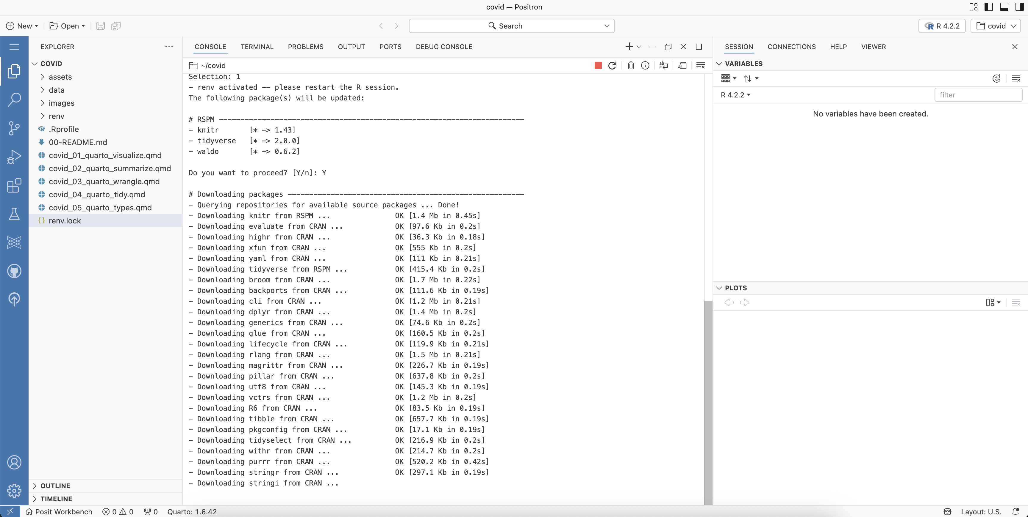 renv::restore()command above and restarting your R session, you may see a message in the Console that says “The project is out-of-sync – userenv::status()for details.” You can ignore this message – you do not need to update therenv.lockfile further.