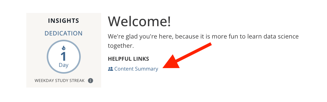 The Content Summary is a single scrollable page containing an overview of the concepts you have learned in the tutorials. The Content Summary updates weekly, and can be found on your Academy campsite homepage, under Helpful Links.